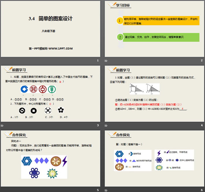 关键词:北师大版八年级下册数学PPT课件免费下载,简单的图案设计PPT下载,图形的平移与旋转PPT下载,.PPT格式;
