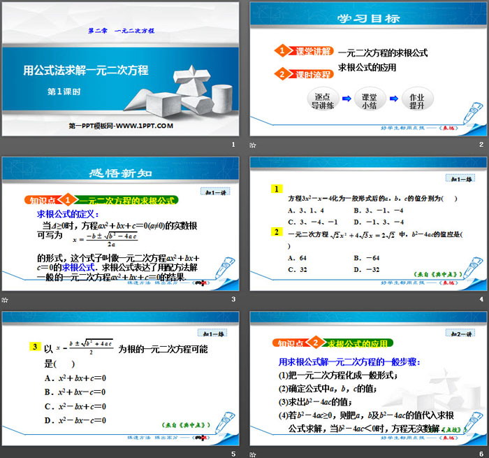关键词:北师大版九年级上册数学PPT课件免费下载,用公式法求解一元二次方程PPT下载,一元二次方程PPT下载,.PPT格式;