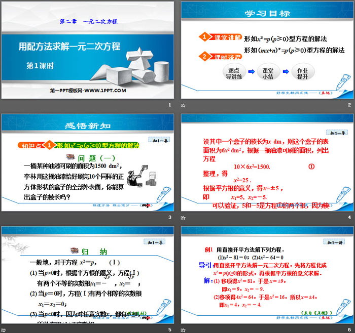 关键词:北师大版九年级上册数学PPT课件免费下载,用配方法求解一元二次方程PPT下载,一元二次方程PPT下载,.PPT格式;