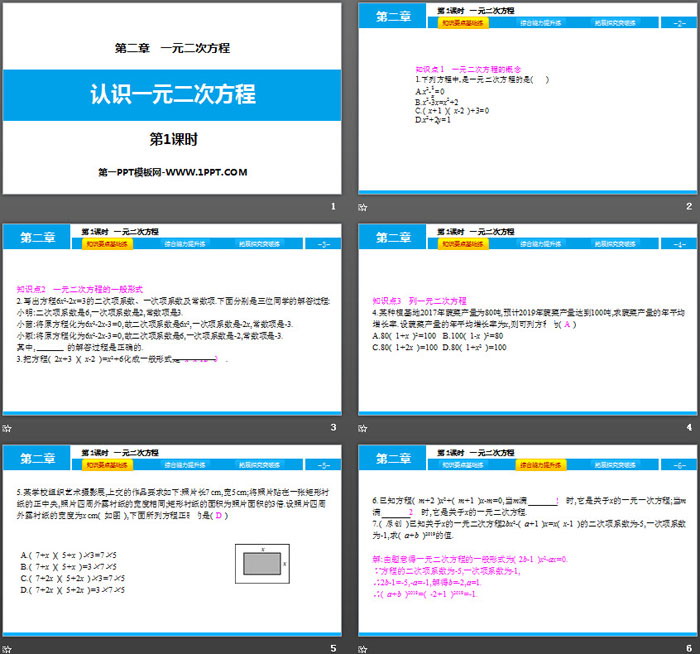 关键词:北师大版九年级上册数学PPT课件免费下载,认识一元二次方程PPT下载,一元二次方程PPT下载,.PPT格式;