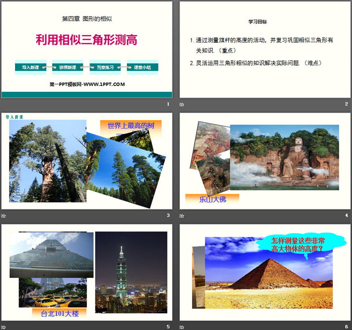 关键词:北师大版九年级上册数学PPT课件免费下载,利用相似三角形测高PPT下载,图形的相似PPT下载,.PPT格式;