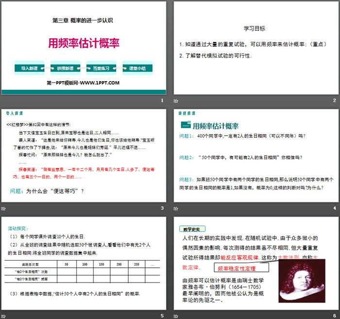 关键词:北师大版九年级上册数学PPT课件免费下载,用频率估计概率PPT下载,概率的进一步认识PPT下载,.PPT格式;
