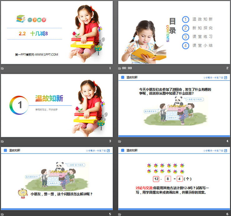 关键词:20以内的退位减法PPT课件免费下载,十几减8PPT下载,.PPT格式;