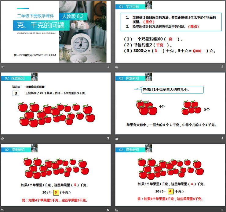 1.(选自教材P106 T9)调查一下500克鸡蛋有几个。估一估65个鸡蛋约重多少千克。