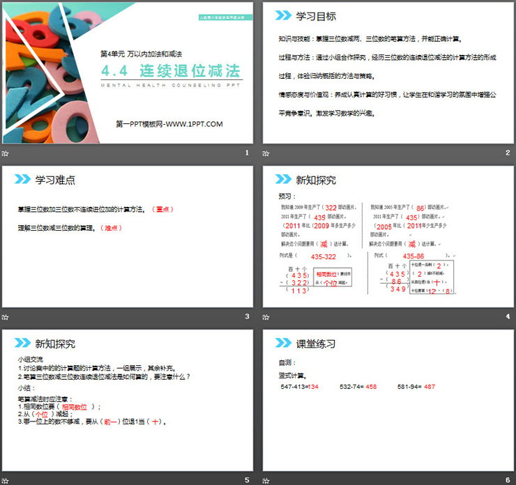 关键词:连续退位减法PPT课件免费下载,万以内加法和减法PPT下载,.PPT格式;