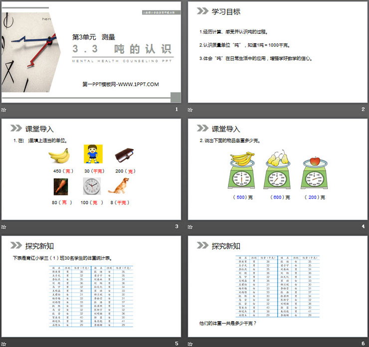 3.体会“吨”在日常生活中的应用,增强学好数学的信心。