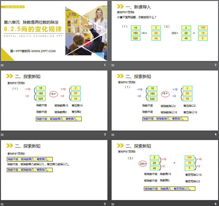 关键词:商的变化规律PPT课件免费下载,除数是两位数的除法PPT下载,.PPT格式;