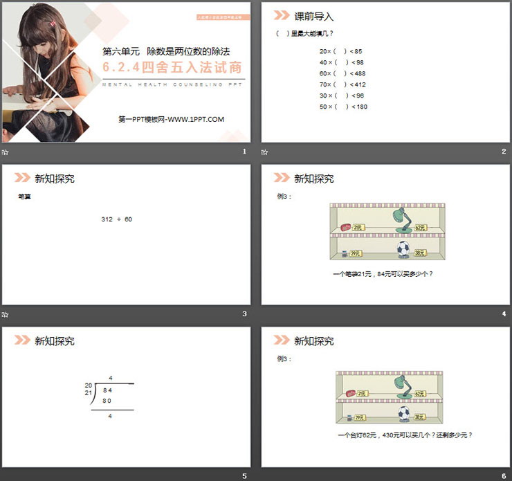 关键词:四舍五入法试商PPT课件免费下载,除数是两位数的除法PPT下载,.PPT格式;