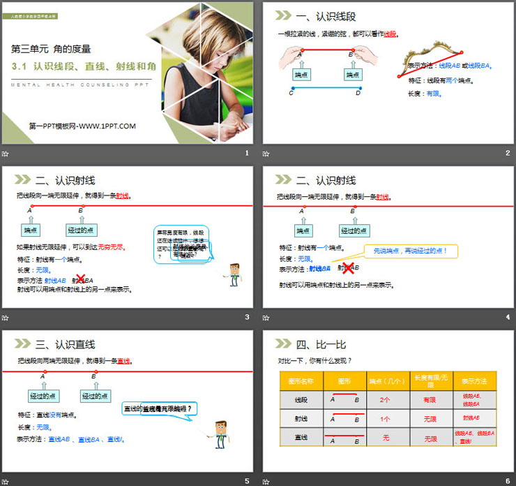 关键词:角的度量PPT课件免费下载,认识线段直线射线和角PPT下载,.PPT格式;