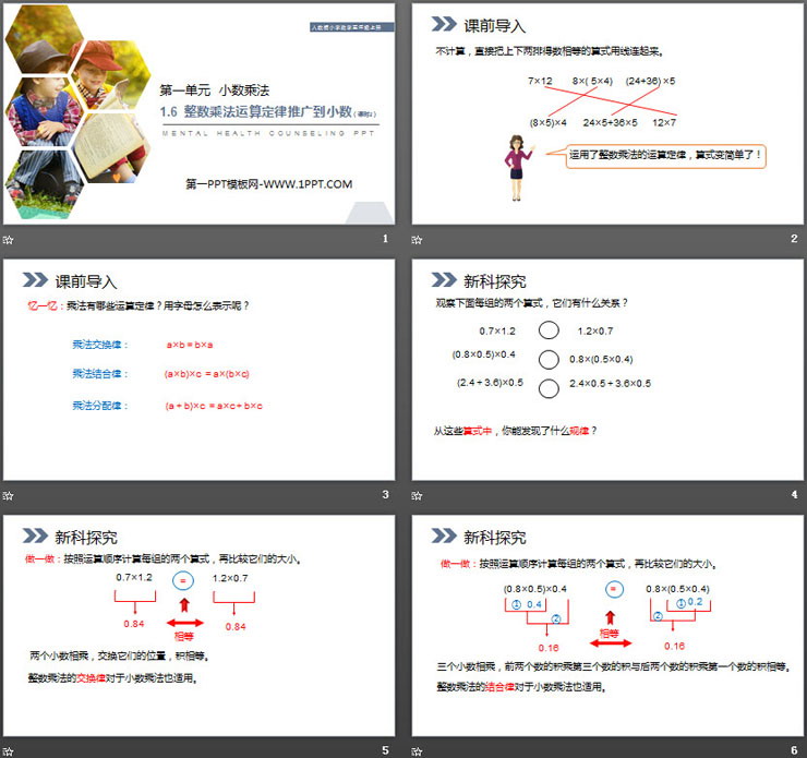 关键词:小数乘法PPT课件免费下载,整数乘法运算定律推广到小数PPT下载,.PPT格式;