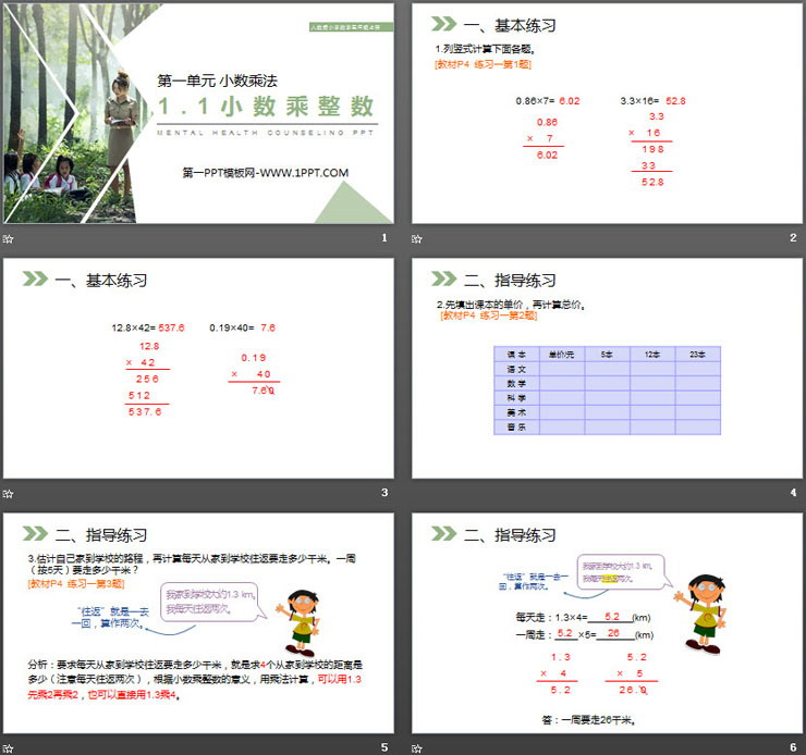分析:要求每天从家到学校往返要走多少千米,就是求4个从家到学校的距离是多少(注意每天往返两次),根据小数乘整数的意义,用乘法计算,可以用1.3先乘2再乘2,也可以直接用1.3乘4。