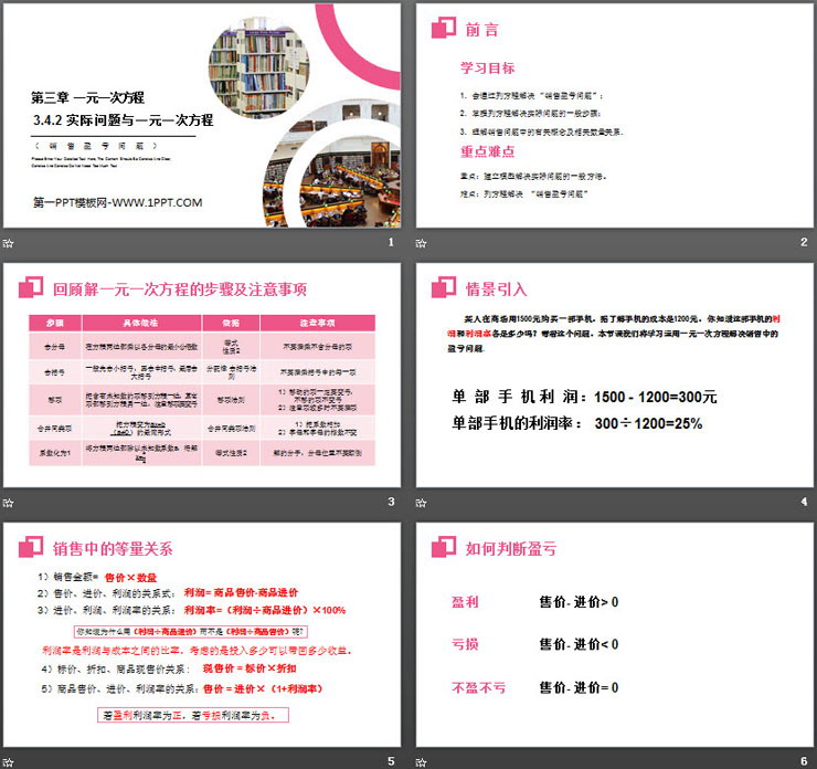 某人在商场用1500元购买一部手机,据了解手机的成本是1200元,你知道这部手机的利润和利润率各是多少吗?带着这个问题,本节课我们将学习运用一元一次方程解决销售中的盈亏问题.