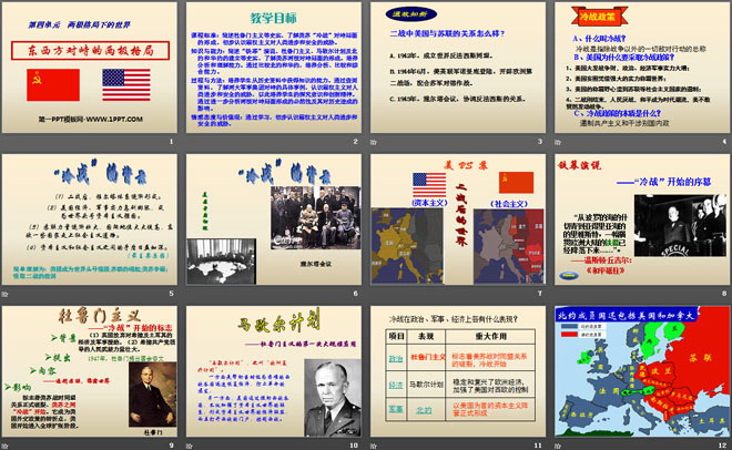 知识与能力:简述“铁幕”演说、杜鲁门主义、马歇尔计划及北约和华约的建立等史实,了解美苏两极对峙局面的形成。培养分析和理解能力。通过比较北约和华约,培养分析、比较和综合能力。