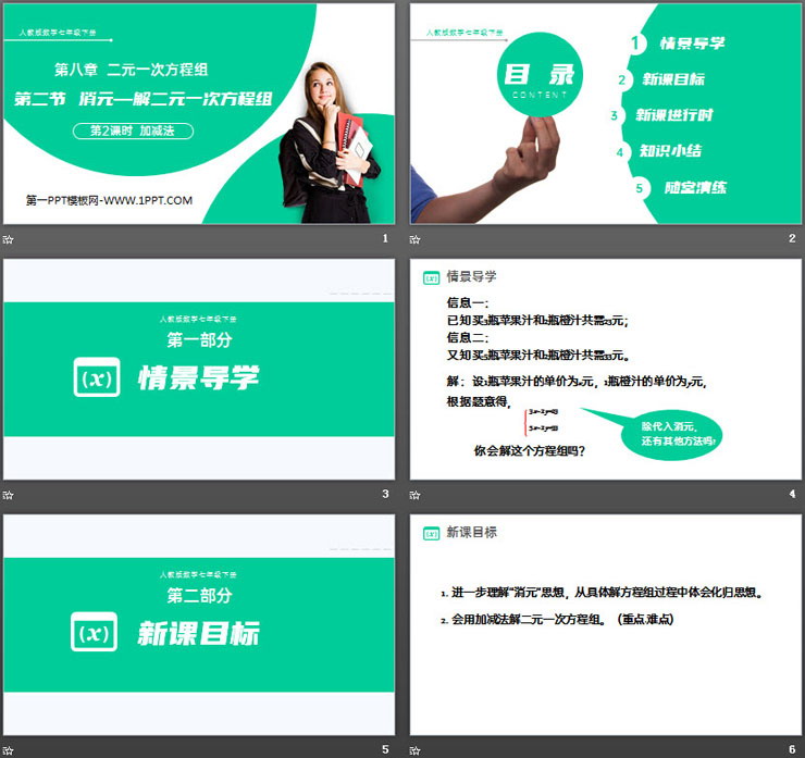 关键词:消元解二元一次方程组PPT课件免费下载,二元一次方程组PPT下载,加减法PPT下载,.PPT格式;