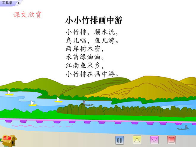 新人教版小学一年级语文上册第3课小小竹排画中游Flash动画课件下载;本课件包括课文朗读,听写练习等,使小朋友们更加容易接受课文意思;小小竹排画中游小竹排,顺水流,鸟儿唱,鱼儿游。两岸树木密, 禾苗绿油油。江南鱼米乡,小小竹排画中游。关键词:人教版PPT课件下载,新课标语文课件,人教版小学语文一年级上册,《小小竹排画中游》flash课件下载;