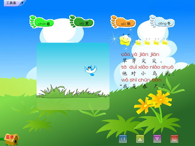 新人教版小学一年级语文上册第2课四季Flash动画课件下载;带有课文朗读和flash动画效果,让学生们图文并茂的体会四季这篇课文;关键词:一年级语文上册课件人教小学语文一年级上册四季课件下载,flash格式;