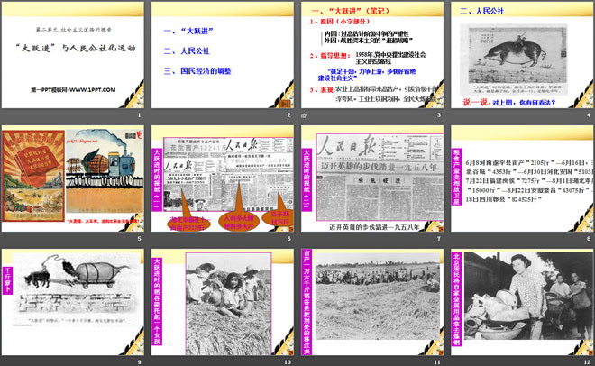 关键词:社会主义道路的探索教学课件,大跃进与人民公社化运动教学课件,华师大版八年级下册历史PPT课件下载,八年级历史幻灯片课件下载,社会主义道路的探索PPT课件下载,大跃进与人民公社化运动PPT课件下载,.PPT格式;