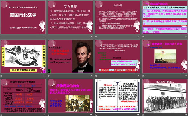 1、掌握南北战争的原因、起止时间、核心问题、导火线、《解放黑人奴隶宣言》、南北战争的意义等知识点。