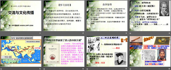 1、知道马可·波罗来华、四大发明的外传,阿拉伯数字的发明和传播等史实,培养探讨世界各民族各地区和平交往历史意义的能力。