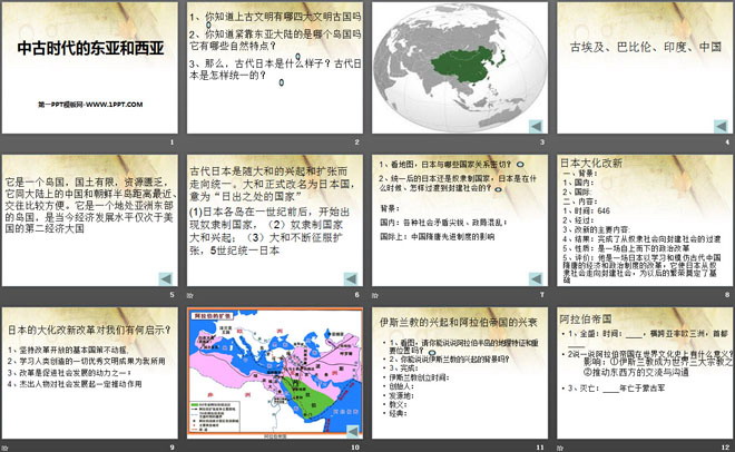 关键词:中古亚欧文明教学课件,中古时代的东亚和西亚教学课件,华师大版九年级上册历史PPT课件下载,九年级历史幻灯片课件下载,中古亚欧文明PPT课件下载,中古时代的东亚和西亚PPT课件下载,.PPT格式;
