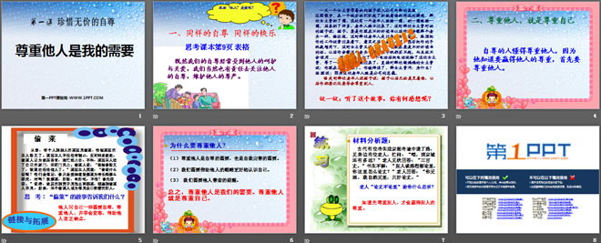 关键词:珍惜无价的自尊教学课件,尊重他人是我的需要教学课件,新人教版七年级下册思想品德PPT课件,七年级思想品德幻灯片课件下载,珍惜无价的自尊PPT课件下载,尊重他人是我的需要PPT课件下载,.ppt格式