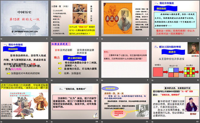 关键词:秦汉统一王朝教学课件,新的大一统教学课件,岳麓版七年级上册历史PPT课件下载,七年级历史幻灯片课件下载,秦汉统一王朝PPT课件下载,新的大一统PPT课件下载,.PPT格式;