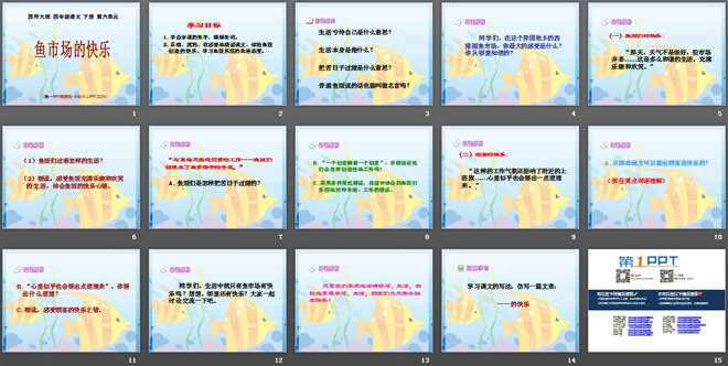 关键词:鱼市场的快乐课件PPT,西师大版四年级下册语文PPT课件下载,四年级语文幻灯片课件下载,鱼市场的快乐PPT课件下载,.PPT格式
