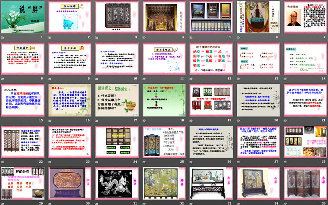 2、了解中国古代的屏风,进一步了解中国古代传统文化。体会作者对“屏”的感情。