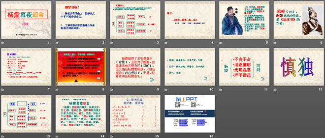 关键词:杨震暮夜却金课件,北师大版六年级上册语文PPT课件下载,六年级语文幻灯片课件下载,杨震暮夜却金PPT课件下载,.PPT格式;