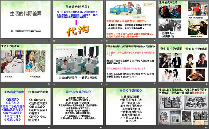 关键词:人教版七年级下册历史与社会PPT课件免费下载,生活的代际差异PPT下载,生活的变化PPT下载,.PPT格式;