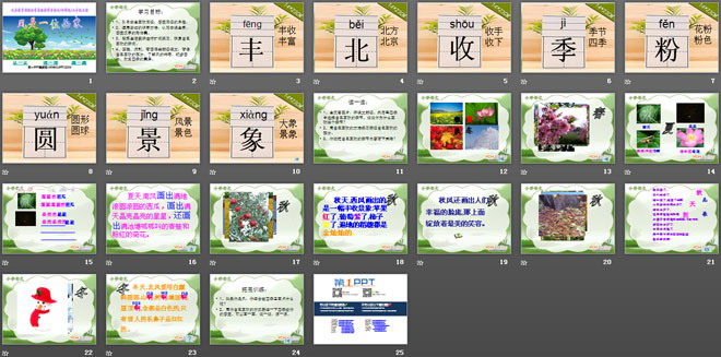 秋天,西风画出的是一幅丰收景象:苹果红了,葡萄紫了,柿子黄了,遍地的稻穗都是金灿灿的。