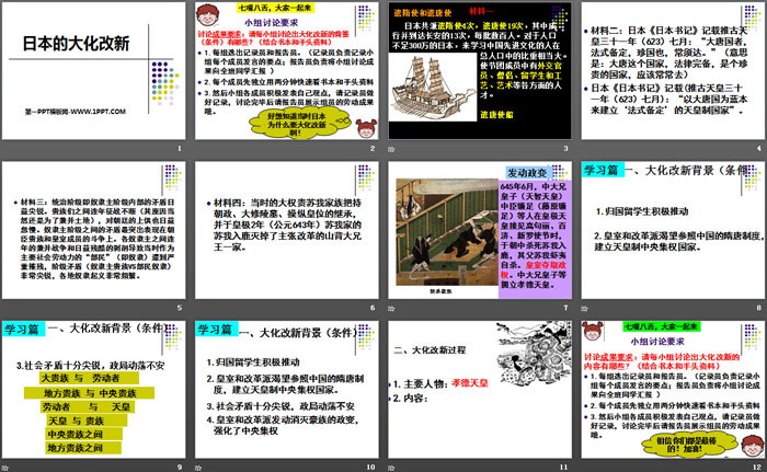 讨论成果要求:请每小组讨论出大化改新的背景(条件)有哪些?(结合书本和手头资料)