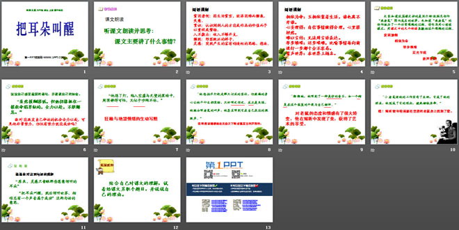 关键词:把耳朵叫醒课件,西师大版六年级上册语文PPT课件下载,六年级语文幻灯片课件下载,把耳朵叫醒PPT课件下载,.PPT格式;