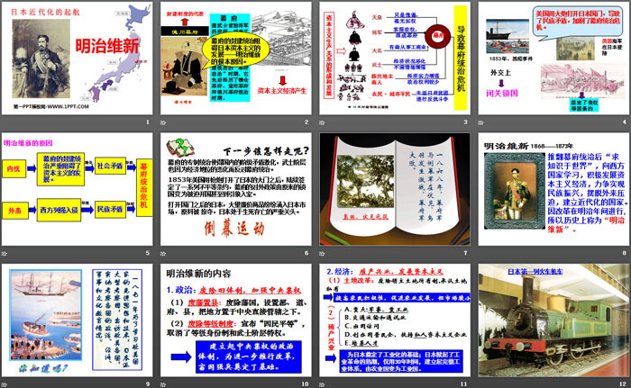 关键词:人教版八年级下册历史与社会PPT课件免费下载,明治维新PPT下载,席卷全球的工业文明浪潮PPT下载,.PPT格式;