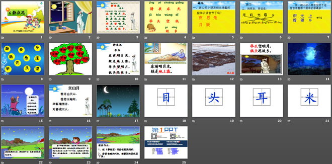 关键词:静夜思教学课件,鲁教版一年级上册语文PPT课件下载,一年级语文幻灯片课件下载,静夜思PPT课件下载,.PPT格式;