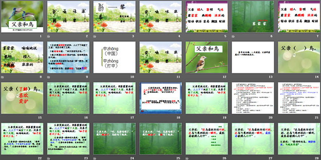 关键词:父亲和鸟教学课件,鲁教版二年级上册语文PPT课件下载,二年级语文幻灯片课件下载,父亲和鸟PPT课件下载,.PPT格式;