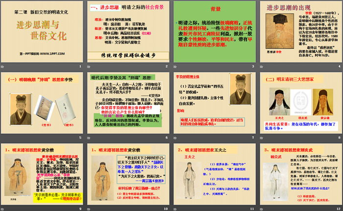 关键词:人教版八年级下册历史与社会PPT课件免费下载,进步思潮与世俗文化PPT下载,新旧交织的明清文化PPT下载,.PPT格式;