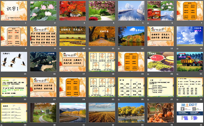 这节课我们学习了很多个秋天的成语,让我们来再回顾一下。