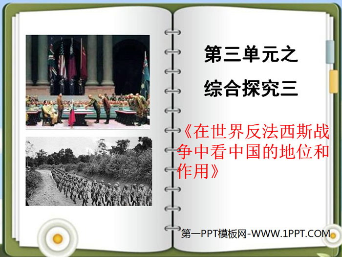 关键词:人教版九年级上册历史与社会PPT课件免费下载,在世界反法西斯战争中看中国的地位和作用PPT下载,中国抗日战争与世界反法西斯战争PPT下载,.PPT格式;