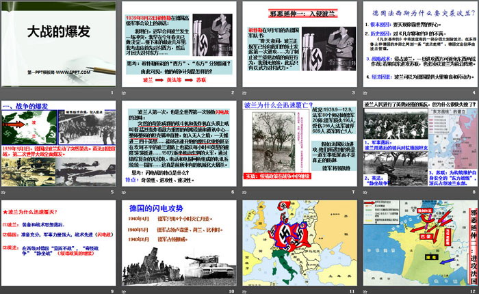关键词:人教版九年级上册历史与社会PPT课件免费下载,大战的爆发PPT下载,中国抗日战争与世界反法西斯战争PPT下载,.PPT格式;