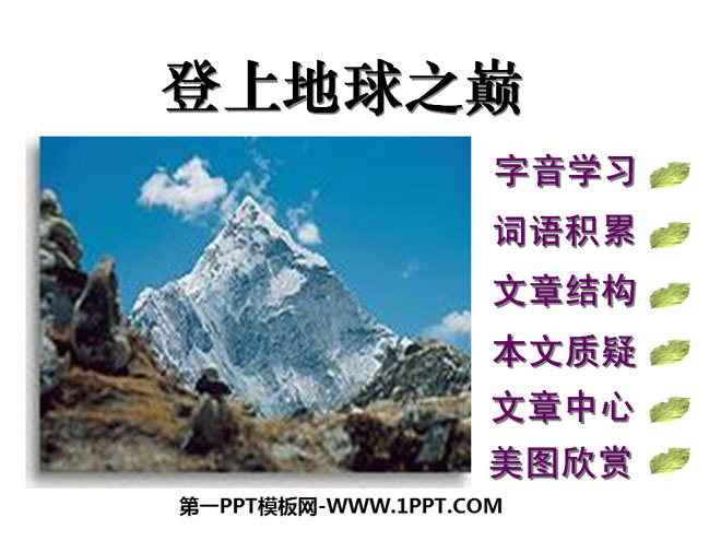 关键词:登上地球之巅教学课件,鲁教版六年级下册语文PPT课件下载,六年级语文幻灯片课件下载,登上地球之巅PPT课件下载,.PPT格式;