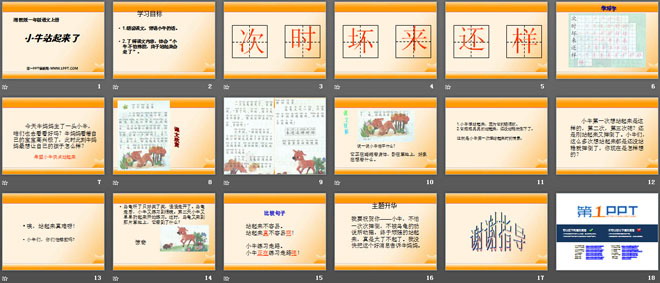 关键词:小牛站起来教学课件,湘教版一年级上册语文PPT课件下载,一年级语文幻灯片课件下载,小牛站起来PPT课件下载,.PPT格式;