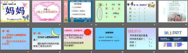 关键词:妈妈教学课件,湘教版一年级上册语文PPT课件下载,一年级语文幻灯片课件下载,妈妈PPT课件下载,.PPT格式;