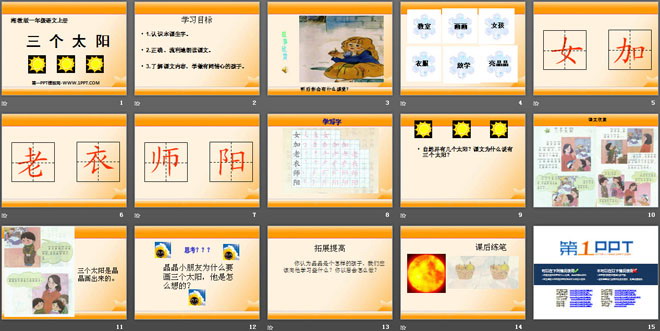 关键词:三个太阳教学课件,湘教版一年级上册语文PPT课件下载,一年级语文幻灯片课件下载,三个太阳PPT课件下载,.PPT格式;