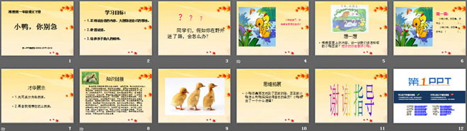 关键词:小鸭你别急教学课件,湘教版一年级下册语文PPT课件下载,一年级语文幻灯片课件下载,小鸭你别急PPT课件下载,.PPT格式;