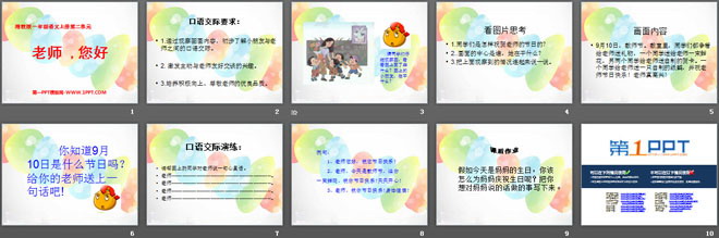 关键词:老师您好教学课件,湘教版一年级上册语文PPT课件下载,一年级语文幻灯片课件下载,老师您好PPT课件下载,.PPT格式;