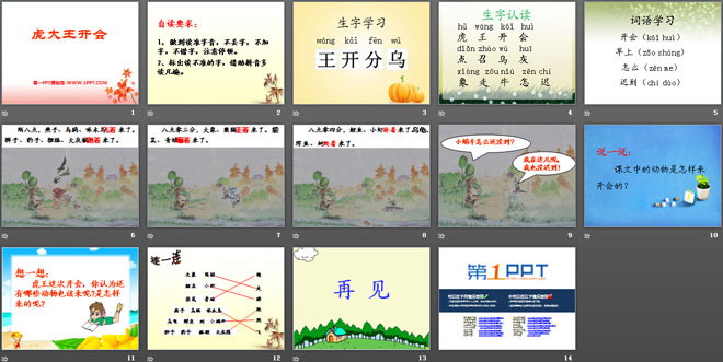 关键词:虎大王开会教学课件,湘教版一年级下册语文PPT课件下载,一年级语文幻灯片课件下载,虎大王开会PPT课件下载,.PPT格式;