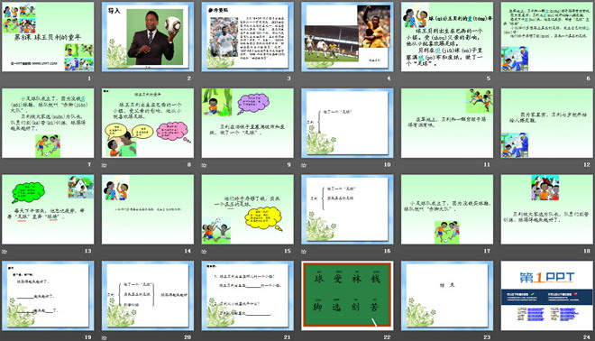 关键词:球王贝利的童年教学课件,湘教版一年级下册语文PPT课件下载,一年级语文幻灯片课件下载,球王贝利的童年PPT课件下载,.PPT格式;