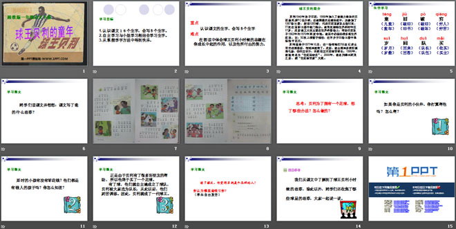 关键词:球王贝利的童年教学课件,湘教版一年级下册语文PPT课件下载,一年级语文幻灯片课件下载,球王贝利的童年PPT课件下载,.PPT格式;