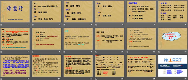 关键词:你能行教学课件,湘教版五年级上册语文PPT课件下载,五年级语文幻灯片课件下载,你能行PPT课件下载,.PPT格式;
